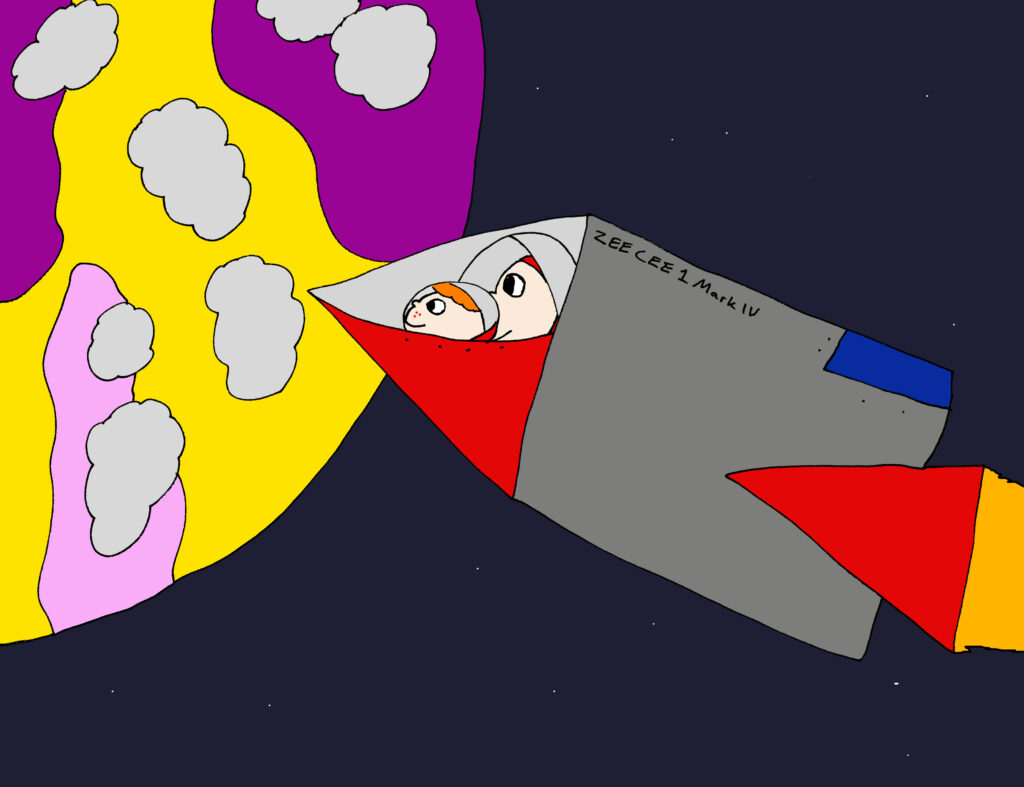 After recalibrating the ship’s F.A.R.T. (Fuel Activated Rocket Timing) App, which as usual required a firm smack to start working, they arrived on Planet Jambori.